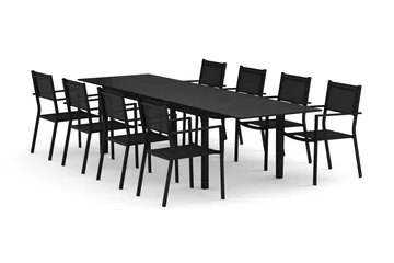 Tunis utendørs spisegruppe, uttrekkbar 205/305x90 cm, med 8 Tunis stablestoler, Svart/svart