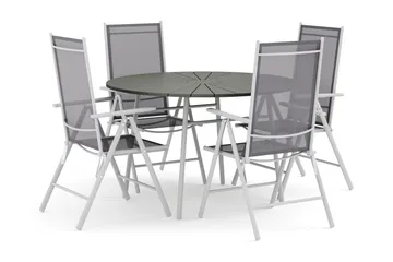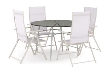 Tunis utendørs rund spisegruppe 120 cm med 4 Jenny spisestoler, Hvit/grå