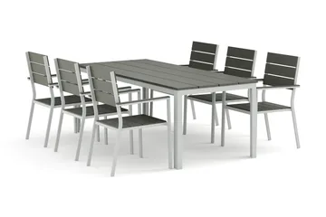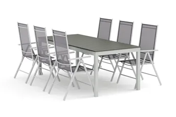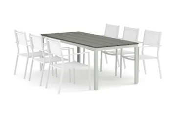 Tunis utendørs spisegruppe 205x90 cm med 6 Tunis stablestoler, Hvit/Grå