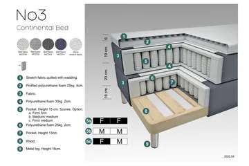Choice No 3 Kontinentalseng er bygd opp på en sengebunn med en tidløs fingerskjøt trestamme og pocketfjæring. Fjærmadrassen består også av pocketfjæring i fem soner, noe som virker trykkavlastende. Overmadrassen som er kantsydd består av profilert skum som er kledd i et stretchstoff, som skaper en god komfort. Choice No 3 Kontinentalseng finnes i to fargevalg; grå og mørkgrå. Madrassens trekk kan tas av og vaskes på 60°. Velg mellom to ulike varianter av ben i metall; metallic- eller kobberfarget. I denne sengepakken inngår også sengegavl. Velg mellom tre fine gavler.