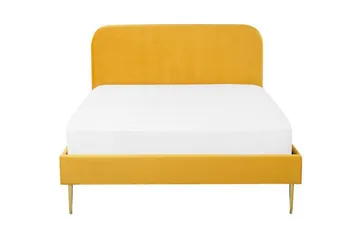 Minimalistisk, polstret dobbeltseng. Løft utseendet på soverommet ditt med denne stilige, minimalistiske sengen. Fløyelstrekket i gul farge er behagelig å ta på, samtidig som det er slitesterkt og har lang levetid, noe som gjør den til et perfekt tilskudd til ethvert interiør som garantert vil vekke oppmerksomhet. Lamellrammen, som er laget av massivt tre, sørger for god, avslappende søvn og riktig fordeling av kroppsvekten. Hele konstruksjonen kompletteres av de gylne bena, som gir sengen et glamorøst preg samtidig som de garanterer stabilitet.