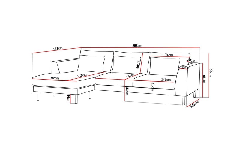 - Mål: B:258 cm H:87 cm D:101 cm